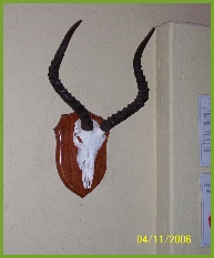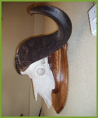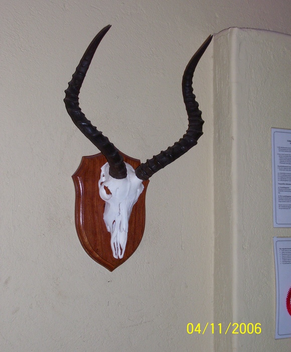 The bleached skull of the animal (with horns) is mounted on a wooden shield (usually Kiaat is used).